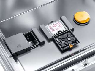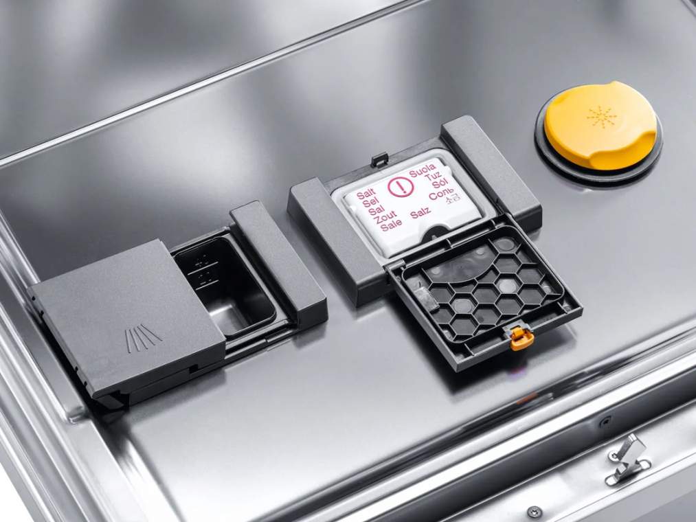 - Opatentowany zbiornik soli w drzwiach - wygodne uzupełnianie soli. Ergonomiczny komfort: Pojemnik na sól w drzwiach można szczególnie łatwo napełnić.